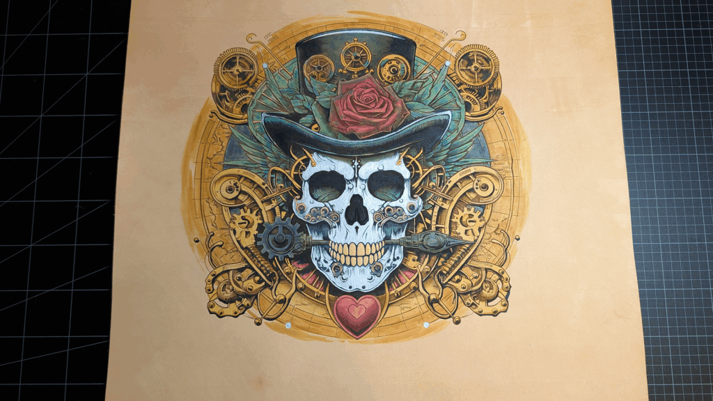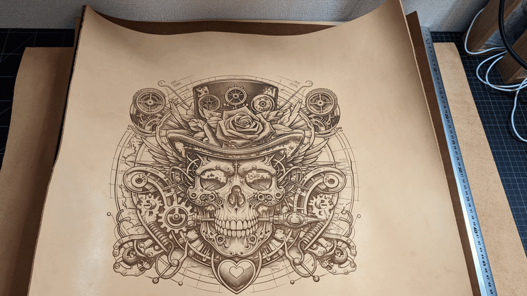 今回は「S8」サイズ想定で割とギリギリの革サイズ約W550mm×D550mm(30.25ds)の革にレーザー彫刻したものです。