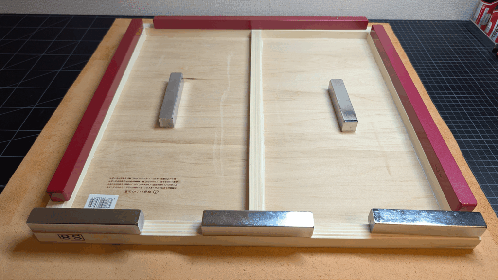 この作業は乾き待ち時間と向かい合わせの二辺ずつ丁寧に折って留める作業と最後の鋲打ちと、とにかく神経使います。